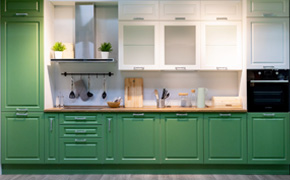 Сложно найти человека, который бы не испытывал удовольствие от созерцания летних пейзажей. Можно продлить себе это удовольствие на все 365 дней, устроив зеленную кухню. Для столовой и кухни идеально подойдут салатовый, фисташковый, мятный. Благодаря ассоциациям со свежей зеленью, эти оттенки не только вкусно звучат, но и поднимают аппетит. Причем это правило одинаково действует как на взрослых, так и на детей. Если же вы не сторонник зеленого цвета в интерьере кухни — пусть на вашем столе будет посуда с яркими салатовыми принтами и прозрачное зеленое стекло. А еще пару горшочков с базиликом и петрушкой на подоконнике.