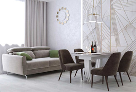 Для этого проекта задачей стояло создать лаконичную, светлую и легкую кухню, а стены оформить в модные текстуры мерцающей декоративной штукатурки и геометричные линии фрески у обеденного стола. Темный цвет стульев как бы обрамляет обеденную группу, а фреска отлично завершает образ трапезной зоны. Диван прекрасно дополняет интерьер, заняв свое место в углу напротив ТВ-зоны.⠀
