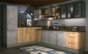• Второй модуль - открытые полки вместо навесных шкафчиков. Минусы такого решения - пыль придется протирать чаще, да и бардак не спрячешь. Зато кухня становится эстетичней, легче и чище. Как компромисс - совместить полки с закрытыми верхними ящиками.